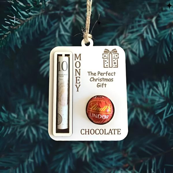📦 Paket sadrži: 3x Božićna ukrasa sa držačem za novac (Dizajni: 1x irvas, 1x poklon kutija, 1x kugla sa tekstom „Merry Christmas“)